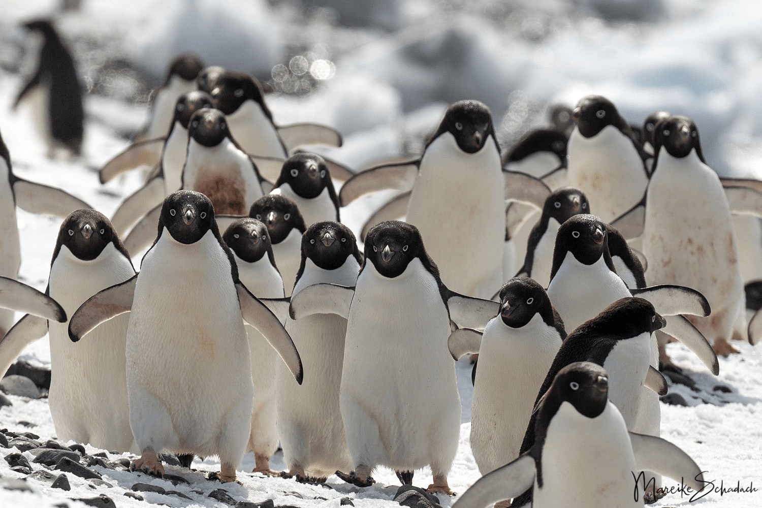 Troop of Adelie penguins (Pygoscelis adeliae) at Browns Bluff, Antarctica
